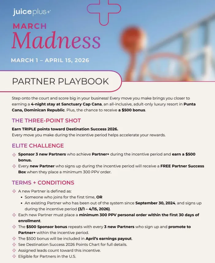 Disclaimer: The information on this page provides education and training on the Juice Plus+ products and compensation plan. The compensation plan is subject to change and represents potential earnings that can vary depending on individual effort and performance. Your actual earnings may be more or less than the examples given. The Juice Plus+ Company's official compensation plan can be found in Phase 1 & Phase 2 documents provided by the Juice Plus+ Company.